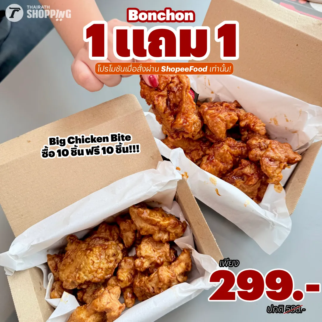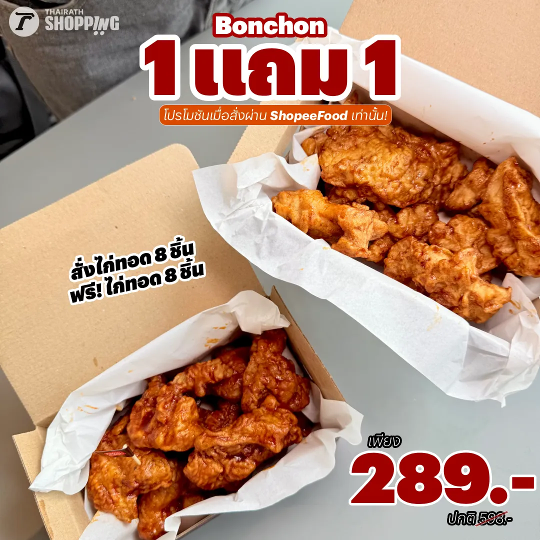 ไก่ทอด 1 แถม 1 โปรโมชันสุดคุ้มที่คนรักไก่ทอดบอนชอนต้องไม่พลาด กับโปร ซื้อไก่ทอด 8 ชิ้น แถมฟรีอีก 8 ชิ้นทันที สามารถเลือกรสชาติได้ไม่ว่าจะเป็นซอสซอย การ์ลิค ซอสฮอท หรือซอสยังนยอม ภายในเซ็ตประกอบด้วย ปีกไก่บนบอนชอน 3 ชิ้นและบิ๊กชิกเกนไบท์ 5 ชิ้น (ในเซ็ตไม่มีหัวไชเท้าดองและเครื่องเคียงให้) โปรโมชันเมื่อสั่งผ่าน ShopeeFood เท่านั้น