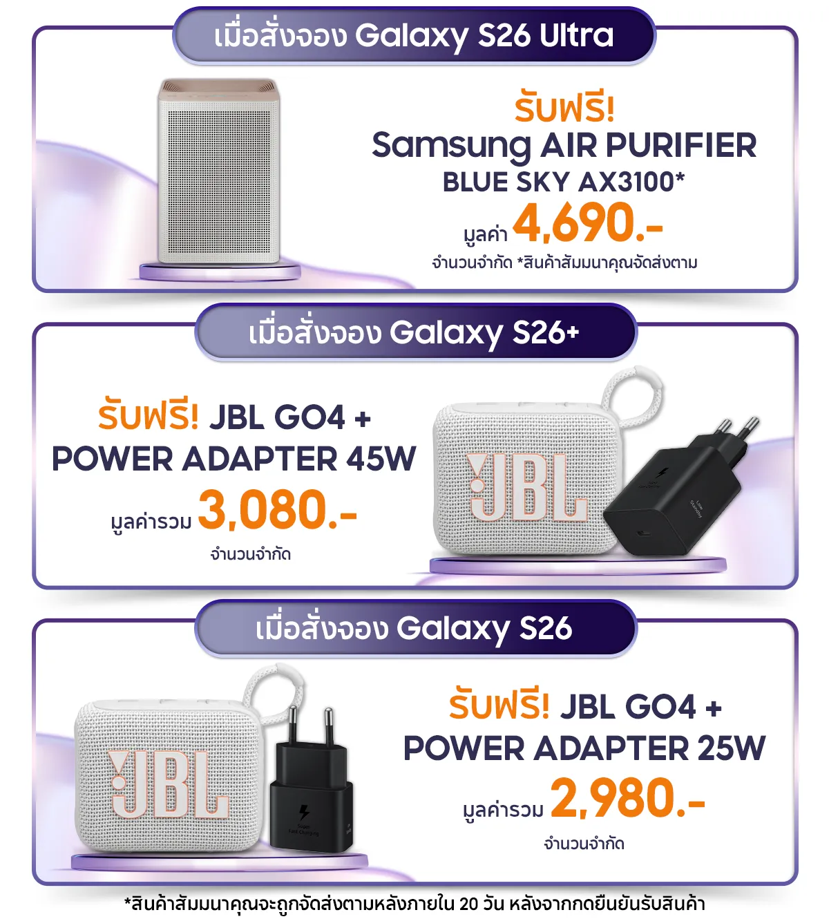 - สั่งจอง Samsung Galaxy S26 รับ JBL GO4 + Power Adapter 25W มูลค่า 2,980 บาท