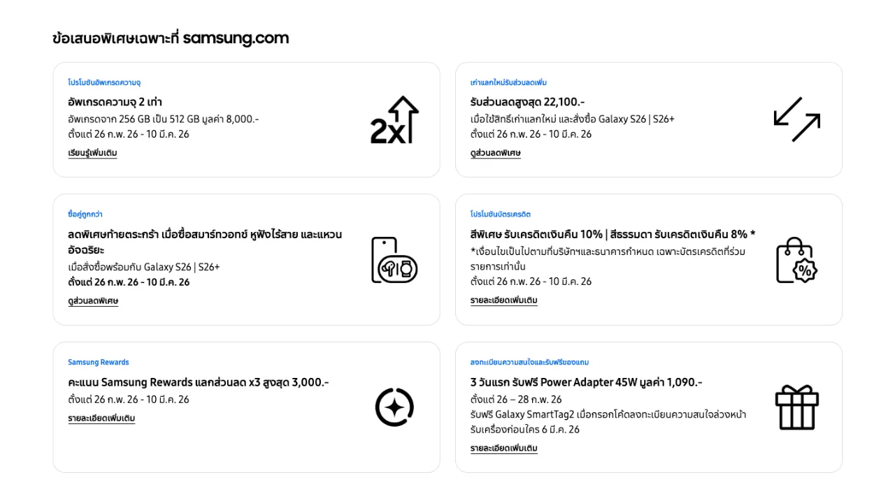 ใครที่สั่งซื้อ Samsung S26 Series ในช่วงวันที่ 26 ก.พ. 26 - 10 มี.ค. 26 สามารถอัพเกรดความจุเพิ่มได้ 2 เท่า ในราคาที่ถูกลง โดยสามารถอัพเกรดจาก 256GB เป็น 512GB และ 512GB เป็น 1TB มูลค่า 8,000 บาท - เก่าแลกใหม่รับส่วนลดเพิ่ม