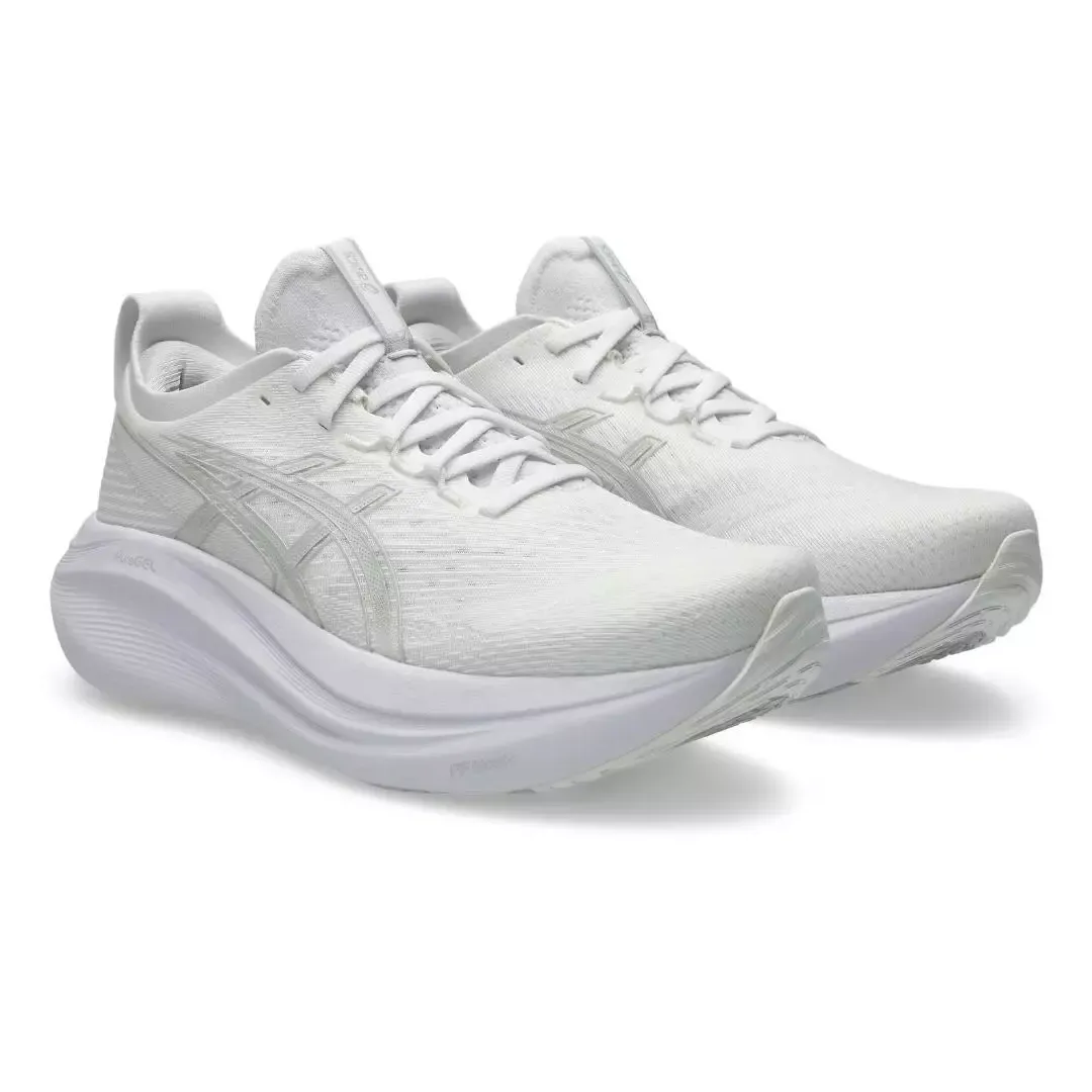 รองเท้าผ้าใบสีขาว ผู้ชาย Asics รุ่น Gel-Nimbus 27 รองรับทั้งการใส่วิ่งออกกำลังกาย และการใส่เดินในชีวิตประจำวัน พื้นรองเท้าหนาพิเศษ แต่มีน้ำหนักเบา สามารถรองรับแรงกระแทกได้ดี ให้สัมผัสนุ่มสบายและกระชับเท้า มีประสิทธิภาพในการยึดเกาะพื้นถนน จะใส่วิ่งระยะใกล้ วิ่งระยะไกล หรือใส่เดินนานๆ ก็ไม่รู้สึกปวดเท้า