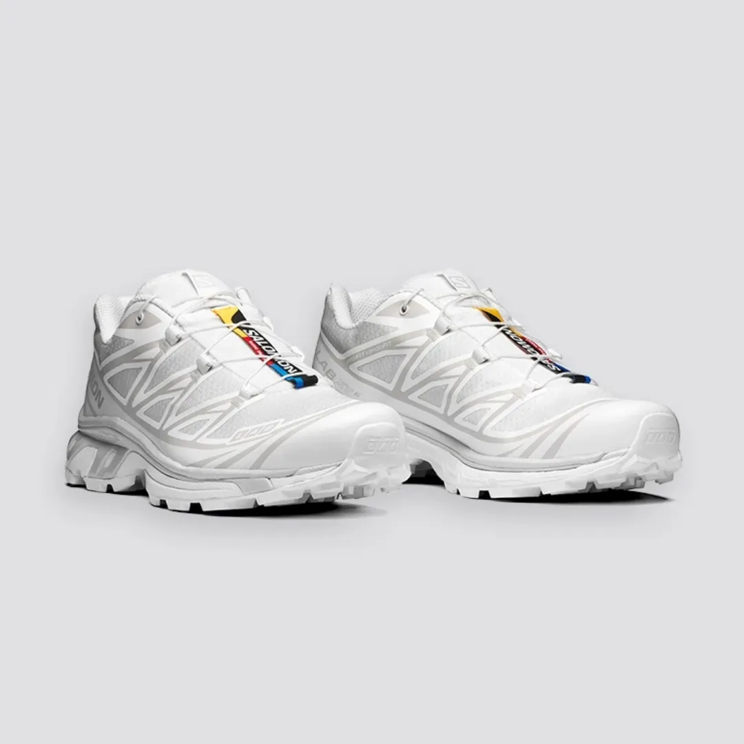 รองเท้าผ้าใบสีขาว Salomon รุ่น XT-6 ออกแบบมาให้มีดีไซน์ทันสมัย สไตล์สตรีทแฟชั่น สวมใส่ได้ทั้งผู้หญิงและผู้ชาย เหมาะกับทั้งสายแฟชั่นและสายลุย ไม่ว่าจะใส่ในวันสบายๆ ใส่วิ่งเทรล หรือใส่เดินป่าก็ตอบโจทย์ โดดเด่นด้วยพื้นรองเท้าที่ใช้เทคโนโลยี Contagrip® สามารถยึดเกาะพื้นและดูดซับแรงกระแทกได้ดี ทั้งยังเฟิร์มนุ่ม กระชับเท้า และมีน้ำหนักเบาเพียง 365 กรัม ใส่ได้นานต่อเนื่องโดยไม่เจ็บเท้า