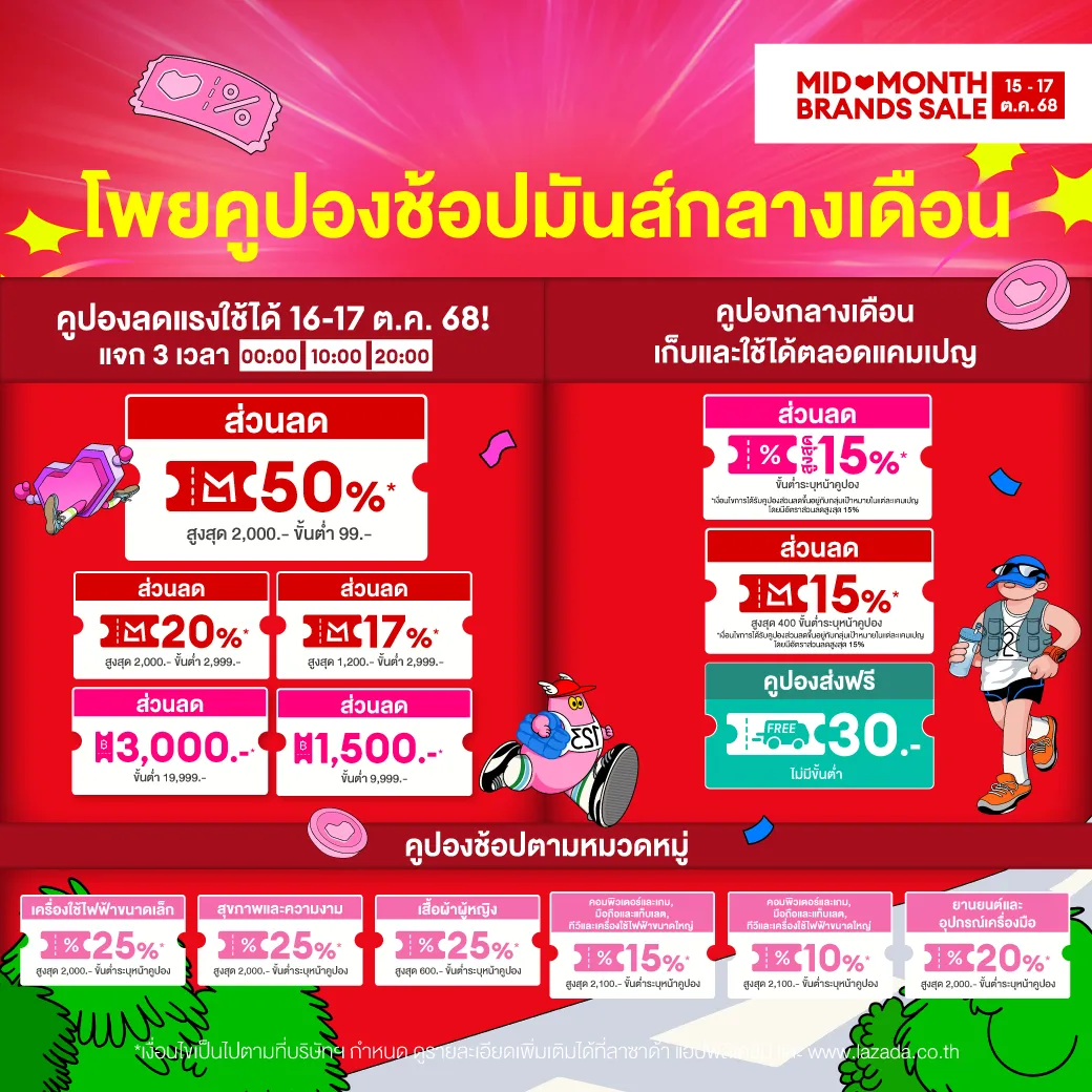 สำหรับโปรโมชันกลางเดือน Lazada กลับมาพร้อมแคมเปญใหญ่ Lazada Mid Month Sale 10.15 ช็อปสุดคุ้มกับดีลเด็ดตลอด 3 วันเต็ม สินค้าลดสูงสุดถึง 90% พร้อมแจกคูปองส่วนลดจากแพลตฟอร์มสูงสุด 3,000 บาท และคูปองจากร้านค้าสูงสุด 20% พร้อม Lazada ช่วยเปย์ สูงสุดถึง 70% และคูปองส่งฟรี เตรียมตัวเก็บโค้ดและช็อปกันให้จุใจระหว่างวันที่ 15 - 17 ตุลาคม 2568